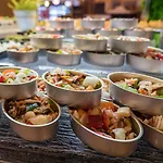 El restaurante del hotel Golden Bahía de Tossa&Spa 4* Sup. ofrece un desayuno caliente buffet. Hay una buena selección de aperitivos y sándwiches disponible en el bar lounge. Entre las opciones para cenar encontrarás el restaurante 4 Peixos, que está a unos 5 minutos a pie.